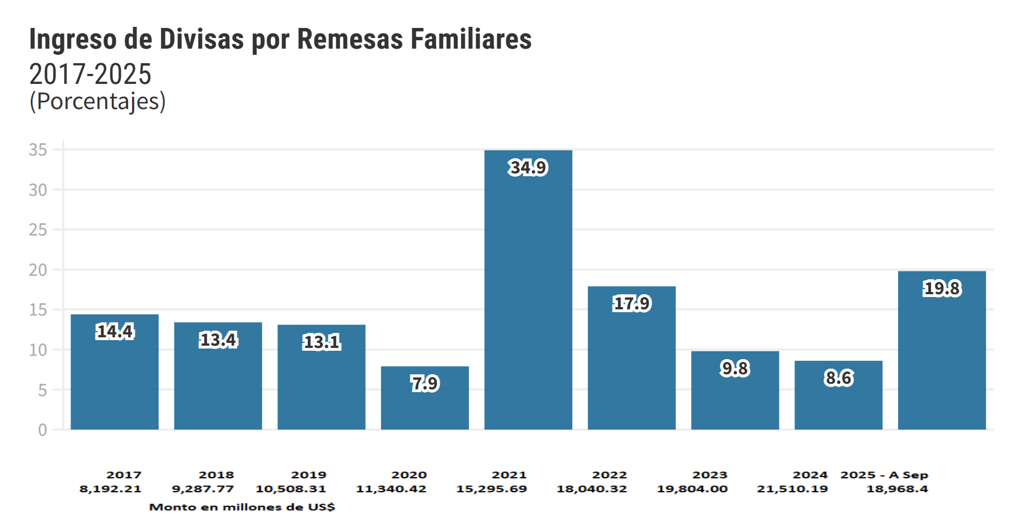 Solo en septiembre de 2025, las remesas alcanzaron los US$ 2,106.7 millones; un crecimiento del 22.2% respecto a septiembre de 2024, en tanto que las proyecciones del banco central, indican que las remesas familiares cerrarán el año con un nuevo récord anual de US$ 24,521 millones, superando ampliamente el récord de 2024 de US$ 21,510.2 millones.