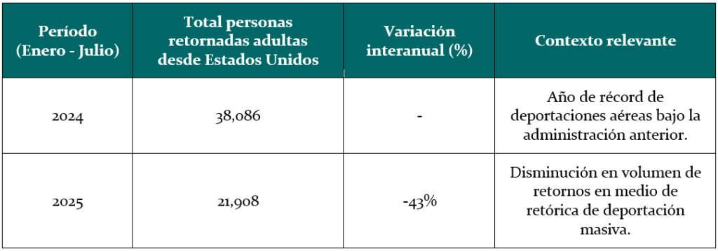 Contrario a la retórica de deportación masiva promovida en 2025, el volumen de personas retornadas vía aérea desde Estados Unidos, ha disminuido notablemente. Entre enero y julio de 2025, el Instituto Guatemalteco de Migración (IGM) registró la recepción de 21,908 adultos deportados. Esta cifra es significativamente inferior a los 38,086 retornados en el mismo período de 2024, lo que representa una reducción de casi el 43%.