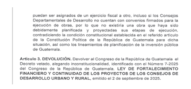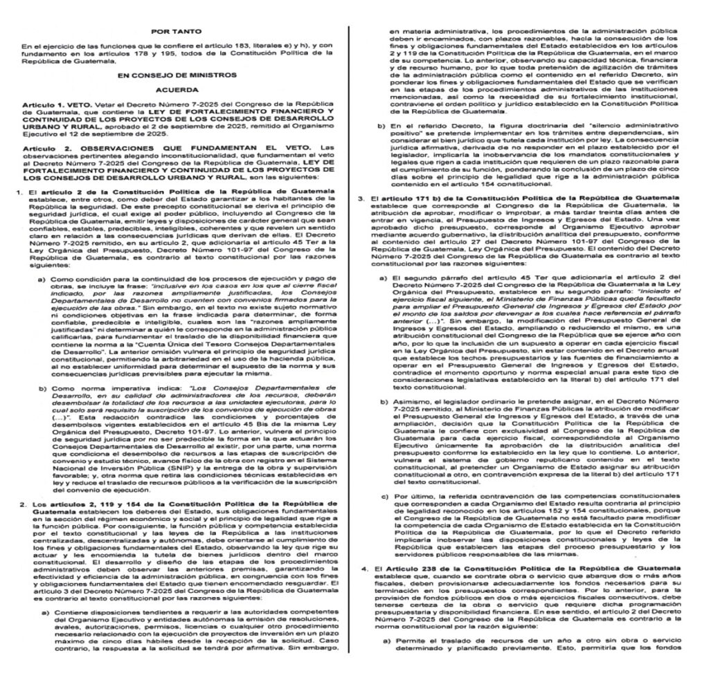 La Corte de Constitucionalidad (CC) resolvió, el 18 de octubre del año en curso, en pleno extraordinario, no otorgar los amparos provisionales en contra del Acuerdo Legislativo No. 6-2025 aprobado el pasado 7 de octubre del presente año por medio del cual, 86 diputados y diputadas de la llamada “oposición política” desconocieron el veto presidencial al Decreto 7-2025, Ley de Fortalecimiento Financiero y Continuidad de los Proyectos de los Consejos de Desarrollo Urbano y Rural, aprobado con 107 votos a favor el 2 de septiembre de 2025, argumentando que el Ejecutivo no lo vetó dentro del plazo de 15 días que establece la Constitución Política.