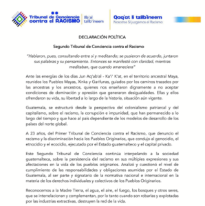 El 6 y 7 de noviembre recién pasados se llevó a cabo en el Museo de la Merced, en el centro histórico de la capital guatemalteca, el Segundo Tribunal de Conciencia contra el Racismo, en el que 20 testigos de honor escucharon denuncias de racismo y discriminación, desde la criminalización a Autoridades Ancestrales tras las movilizaciones de 2023, los despojos constantes a comunidades indígenas, hasta la exclusión de indígenas migrantes y las estructuras del racismo cotidiano, incluso, en organizaciones sociales aliadas.