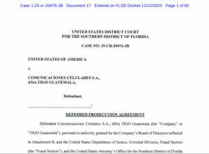 Días después, el 12 de noviembre de 2025, el Departamento de Justicia de Estados Unidos hizo público el Acuerdo de enjuiciamiento diferido celebrado entre la demandada Comunicaciones Celulares, S.A. (COMCEL), que opera bajo el nombre comercial TIGO Guatemala, y la División Penal, Sección de Fraudes, del Departamento de Justicia de Estados Unidos y la Fiscalía Federal del Distrito Sur de Florida. COMCEL, una subsidiaria de Millicom International Cellular S.A. que no fue parte demandada, también aceptó, de conformidad con la autoridad otorgada por el Consejo de Administración de Millicom, determinados términos y obligaciones del Acuerdo.