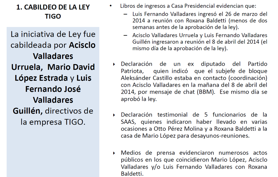(2) La aprobación de una ley en 2014, conocida como “Ley TIGO” porque benefició de manera desproporcionada a TIGO Guatemala.
