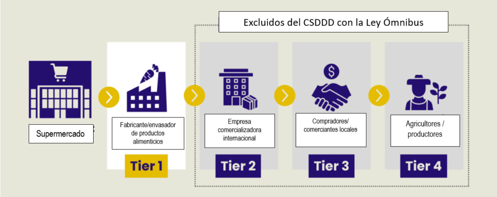 Nota: por Tier se entiende nivel en español. Fuente: David Ollivier de Leth. Save your tiers for another day – Omnibus restriction excludes most supermarket suppliers in risk countries, 22 de abril de 2025.