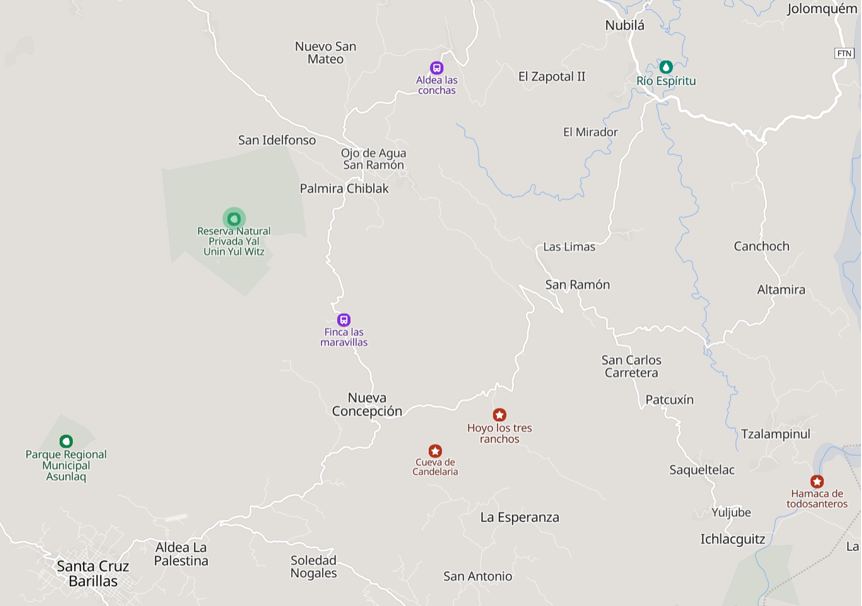 Tramo carretero cuya asfaltado está suspendido. Comunica Santa Cruz Barillas con Río Espíritu en el norte de Huehuetenango, frontera con México. Fuente: Mapcarta.