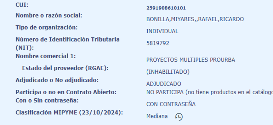 Según el desaparecido diario elPeriódico, Prourba propiedad de Bonilla Miyares, fue una de las empresas preferidas de los gobiernos de Jimmy Morales Cabrera (enero 20216 – enero 2020) y el Frente de Convergencia Nacional (FCN), y Giammattei Falla. De acuerdo con Guatecompras, a Bonilla Miyares se le adjudicaron entre 2019 —último año del gobierno de Morales Cabrera— y 2020 —primer año de gobierno de Giammattei Falla—, más de Q 445 millones, más del 60% del monto total de los contratos obtenidos entre 2005 y 2025. Entre 2024 y 2025 ha sido la Municipalidad de Guatemala, por medio de la Empresa Municipal de Agua (EMPAGUA), la que ha contratado a Prourba con contratos que suman más de Q 20 millones.