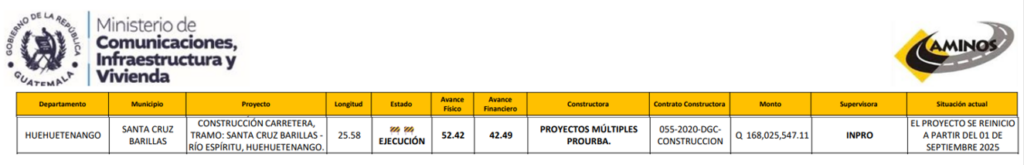 Poco después, el 29 de septiembre, autoridades del CIV y COVIAL hicieron una presentación a jefes de bloque del Congreso de la República, destacando la información del tramo Santa Cruz Barillas y Río Espíritu, donde se anunció que a partir del 1 de septiembre el proyecto se había reiniciado, además de indicar que mostraba más del 50% de avance físico, y cuando se habían desembolsado Q 42.49 millones, confirmando que el monto total del proyecto se incrementó a Q 168 millones, y está bajo la supervisión de la empresa INPRO. No obstante, a la fecha la empresa no muestra ninguna actividad en el tramo carretero.