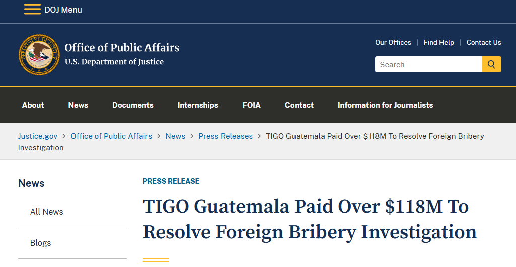 A continuación, ofrecemos una versión al español NO OFICIAL del comunicado de prensa. La versión original en inglés puede verse en el siguiente enlace: https://www.justice.gov/opa/pr/tigo-guatemala-paid-over-118m-resolve-foreign-bribery-investigation