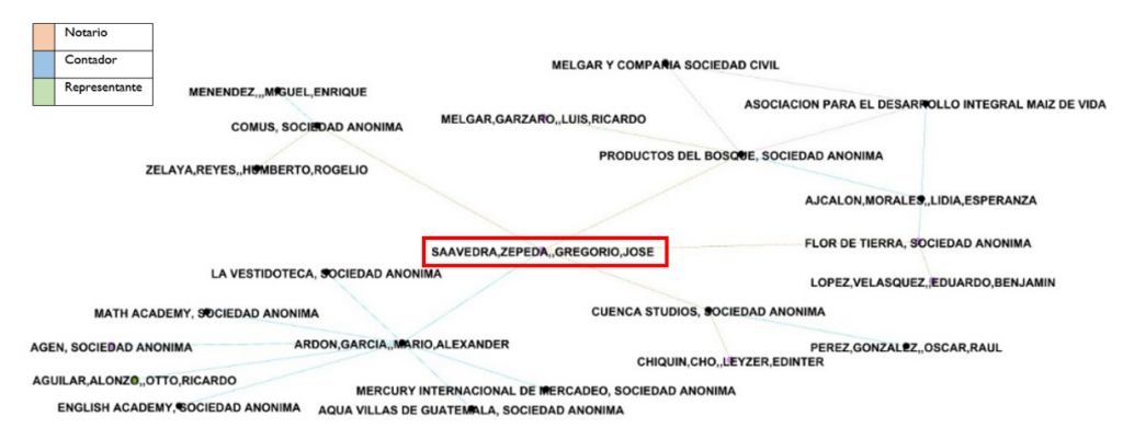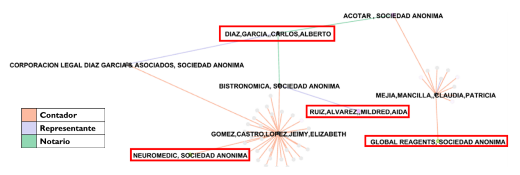 Por otro lado, Carlos Díaz García es representante de Corporación Legal Díaz García & Asociados S.A. (NIT 117367001), bufete a nombre propio que tiene como contadora a Jeimy Elizabeth Gómez Castro de López (NIT 34388729), que también ejerce para la empresa Neuromedic S.A. (NIT 63118068), una entidad enfocada en mercancías médicas cuyo representante es Mario Rolando Villatoro Oseida (NIT 1436848), a quien se vincula a otras dos entidades también enfocadas al área médica.