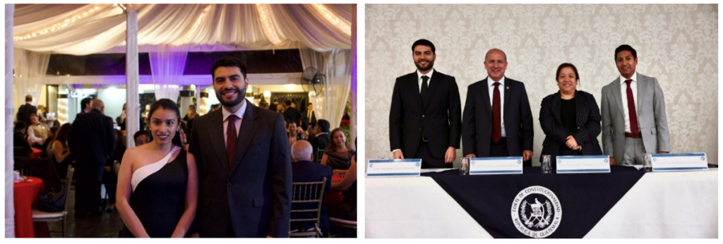 En la foto de la izquierda, José Pacheco junto a María Ovalle Gramajo de García en evento de ASPA, diciembre 2025; en la foto de la derecha, José Pacheco en evento de la CC como director del Instituto de Justicia Constitucional, junto a Nester Vásquez y Claudia Paniagua, septiembre 2024.