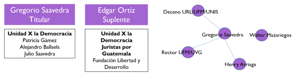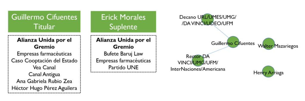 Guillermo Alfonso Cifuentes de León, el candidato a Comisionado Titular de dicha planilla, ha tenido vínculos con farmacéuticas y personas acusadas casos de corrupción de alto impacto, tanto local como internacionalmente, destacando que en su rol de notario le constituyó una empresa a un integrante de una red de narcotráfico transnacional, Ana Gabriela Rubio Zea, procesada en Estados Unidos; además, destaca que su madre, Rosa María de León Cano, ha realizado una larga carrera en el sistema de justicia, ex magistrada de la CSJ y actuaciones oscuras en el caso Myrna Mack.