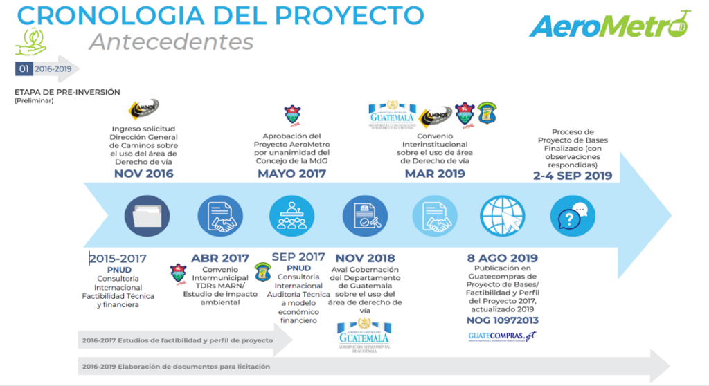 De acuerdo con la Iniciativa de Ley 5934 que el Congreso de la República conoció en 2021 para aprobar la “Concesión para la implementación de un sistema de transporte público por cable aéreo tipo teleférico (AeroMetro) Fase I”, en los municipios de Guatemala y Mixco, por un plazo de 25 años, las raíces del proyecto comenzaron en 2016.