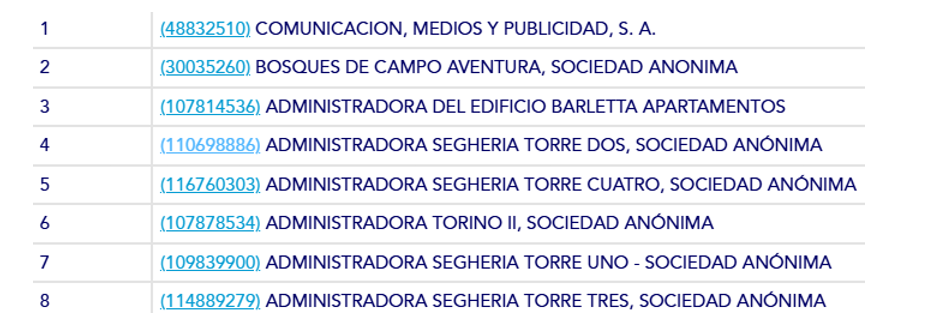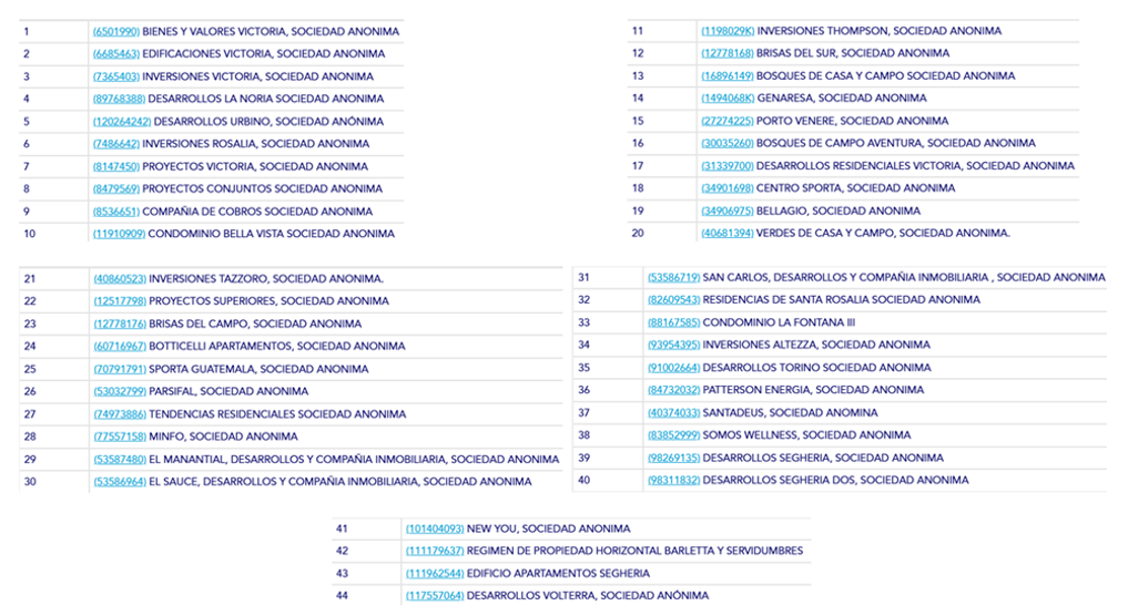 Oficial y públicamente, los nombres de guatemaltecos que trascienden por ser representantes legales de las empresas adjudicadas son: Luis Pedro Figueroa Cruz: Desarrollos Torino y Desarrollos Residenciales Victoria; Roberto Hermann Salomon Gehardt; Doppelmayr Guatemala y Cablevía de Guatemala; mientras que Roberto José Rodríguez Méndez aparece como representante legal de empresas donde Figueroa Cruz también lo es.