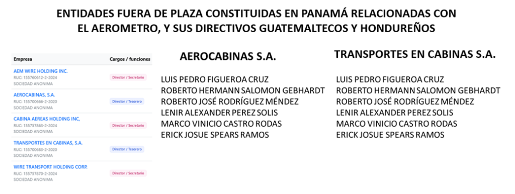 Las entidades constituidas inmediatamente después de adjudicárseles el proyecto AeroMetro, son: Aerocabinas S.A. y Transportes en Cabinas S.A. En ambas aparecen los representantes legales de Corporación Victoria y Alutech Sociedad Anónima de Capital Variable, de Honduras. Sus directivos en Panamá son los mismos que las empresas constituidas en Guatemala.