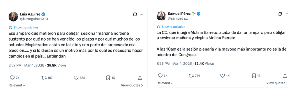 En este contexto, la alianza ultraconservadora en el Congreso de la República activó mecanismos institucionales para forzar el ritmo de la elección de Molina Barreto. El diputado del partido político Valor Carlos López, promovió un amparo contra la Junta Directiva del Legislativo por suspender la sesión plenaria del pasado 3 de marzo, el cual la CC otorgó y le ordenó sesionar para la elección de las Magistraturas Titular y Suplente. En términos políticos y con un evidente conflicto de intereses, la decisión implicó que el tribunal, con una correlación de fuerzas que evidentemente favoreció a Molina Barreto como parte del mismo, ordenó acelerar una votación en un momento en que los números favorecían a dicho bloque.